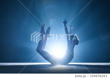 Expressive, artistic young woman, professional ballerina making creative performance against dark blue background with spotlight