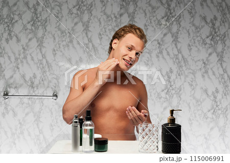 Young man applying facial care cosmetic product and looks at camera as in mirror against marbled wall. Skin care routine.