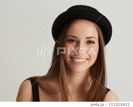 Woman, fedora and fashion with portrait in studio with confidence, pride and retro style by white background. Hipster girl, model or person with trendy hat, clothes and happy with face in Argentina