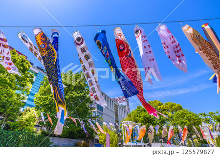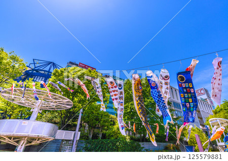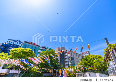 日本の横浜都市景観 地下鉄 「センター南駅」前の鯉のぼりなどを望む