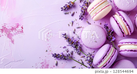 Colorful lavender macarons arranged on a pastel purple background with fresh lavender sprigs, creating a delightful and elegant dessert display