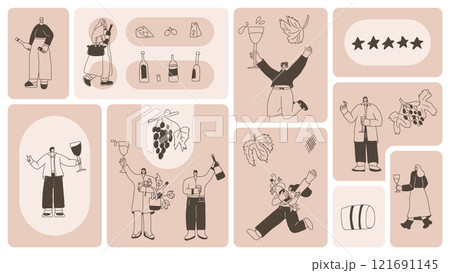 Wine tasting people on bento grid box background. Cellar event on modular mosaic grid. Party with alcohol drinks. Women and men with wineglasses visit a vineyard. Geometric vector doodle illustration