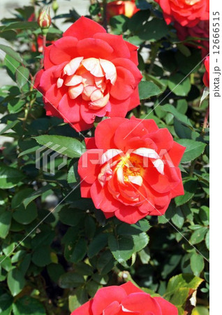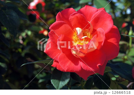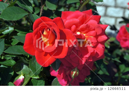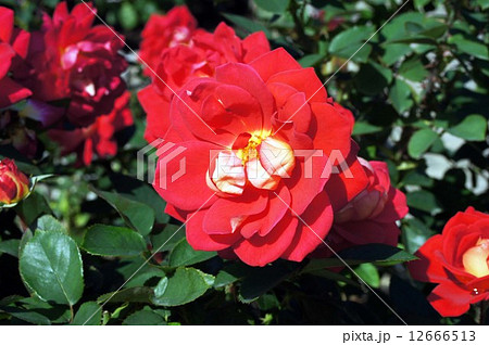薔薇園に赤い薔薇の花が咲いています。このバラの名前はあやおりです。