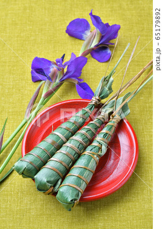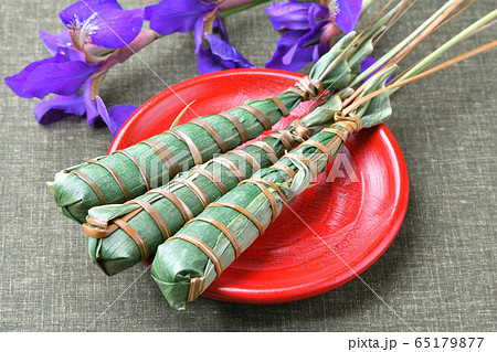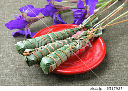 和菓子、端午の節句の供物「ちまき(お団子の笹の葉包み)」花菖蒲(アヤメ)と。