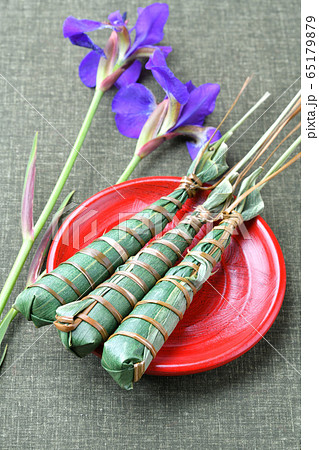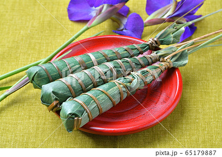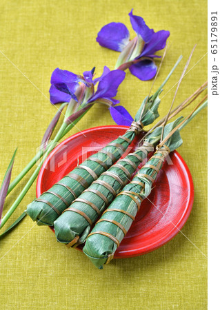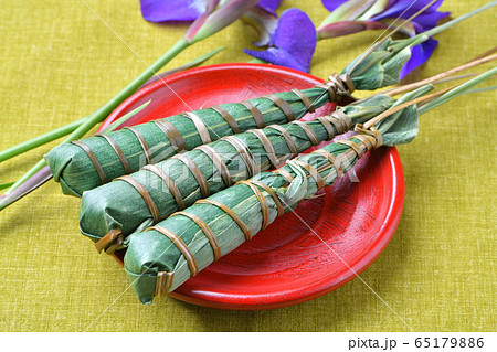和菓子、端午の節句の供物「ちまき(お団子の笹の葉包み)」花菖蒲(アヤメ)と。