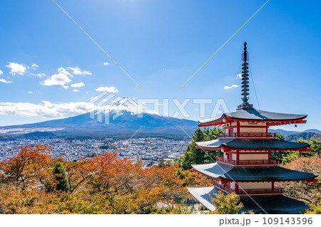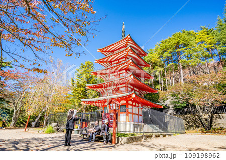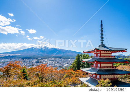 新倉山浅間公園 雄大な富士山と朱塗りの五重塔 桜の紅葉 秋