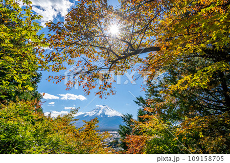 新倉山浅間公園 雄大な富士山と桜の紅葉 秋 光芒