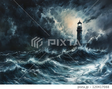 Dramatic Seascape Under Thunderous Skies Menacing Lighthouse Stands Resolute Against Raging Storm
