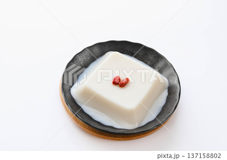 クコの実が乗っているシンプルな杏仁豆腐を白背景で撮影