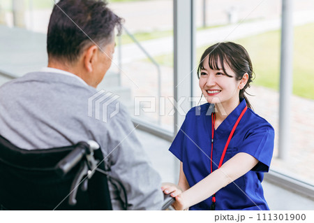 車椅子のシニア男性患者に笑顔で声をかける言語聴覚士・理学療法士の女性(認知症・リハビリ)