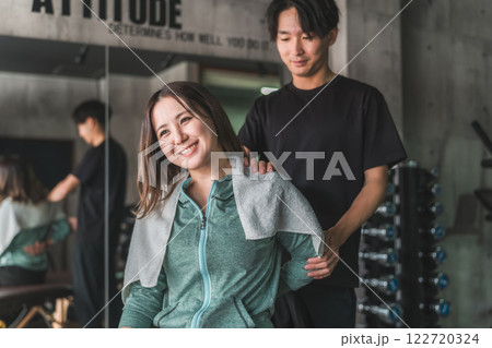 トレーニング後にマッサージの施術を受ける女性とスポーツトレーナー・柔道整復師の男性