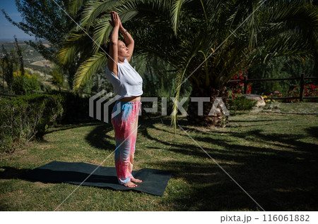 Woman practicing yoga outdoors on a sunny day in a lush garden, stretching and focusing on relaxation and flexibility