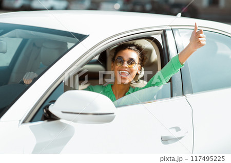 A happy young woman wearing sunglasses gives a thumbs up from inside a white car, while sitting in the drivers seat. The car is parked on a street in a city, and the background is blurred.