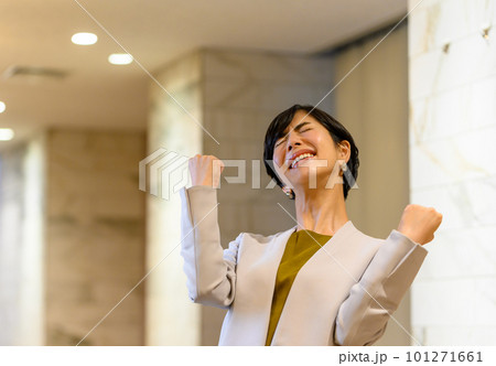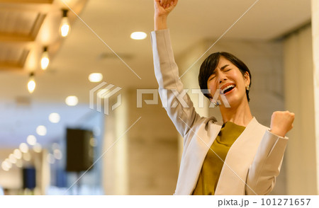 ガッツポーズしながら飛び上がって喜ぶ女性