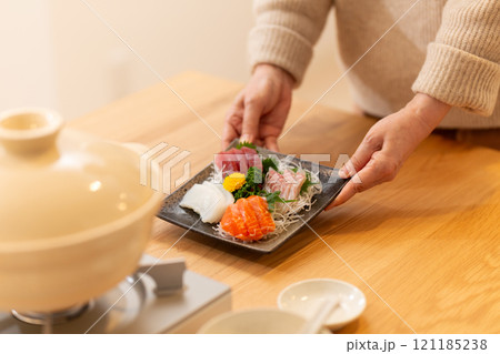 刺身の盛り合わせを食卓に運ぶミドル女性の手元