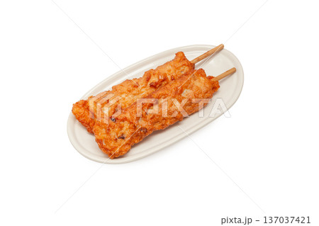 串に刺したサツマ揚げ(イカ、タコ入り)おでん種【白背景・切り抜き】