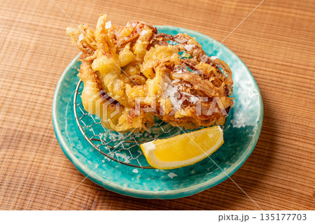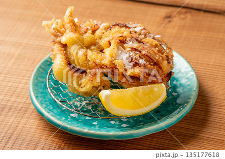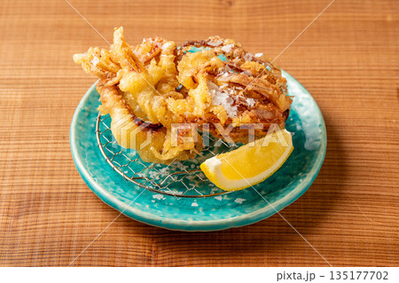 コリコリとした歯ごたえとうま味が味わえる、イカのゲソの天ぷらの写真