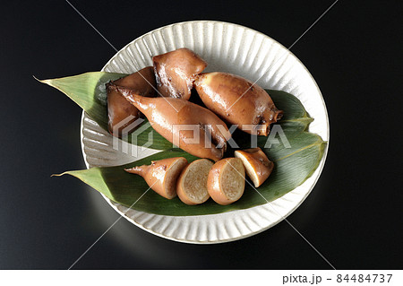 笹の葉に乗っている郷土料理の出来立てイカ飯を黒背景で撮影