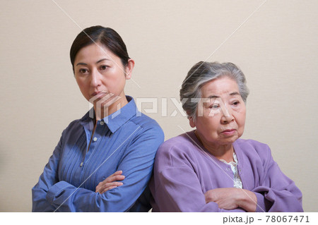 背中合わせでいがみ合う中年女性とおばあちゃん 親子 母と娘 嫁と義母
