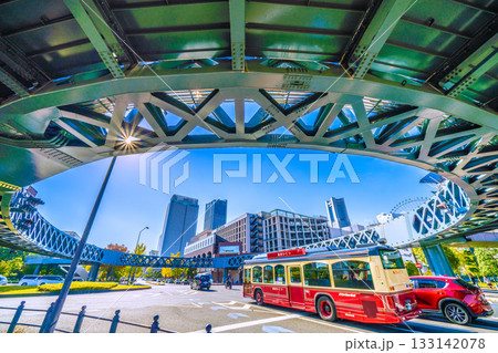 日本の横浜都市景観 歩道橋のある街…新港サークルウォークや横浜ランドマークタワー、あかいくつ…