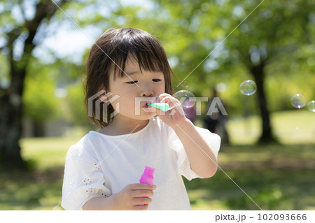 新緑の初夏の公園でシャボン玉をして遊ぶ小さな女の子