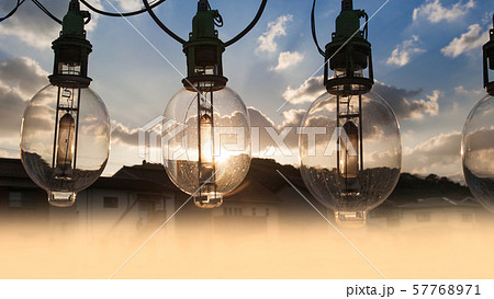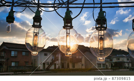 イカ釣り船のランプと夕暮れが迫る空の風景です。旧来の漁りランプ風景です。島根県