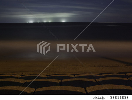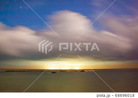 山陰の持石海岸から見えるいさり漁(イカ漁)の明かりと空風景です。島根県