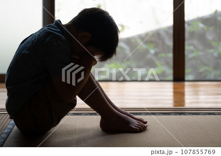 ひざをかかえて泣く子供の水彩イラスト アナログ手描き 背景透過