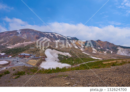 福島県福島市の吾妻小富士の階段からの北西側の眺望(浄土平レストハウス,駐車場,蓬莱山,一切経山,残雪