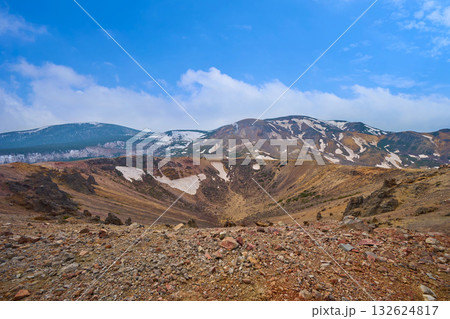 福島県福島市の吾妻小富士の階段からの北西側の眺望(浄土平,駐車場,蓬莱山,一切経山,残雪など)