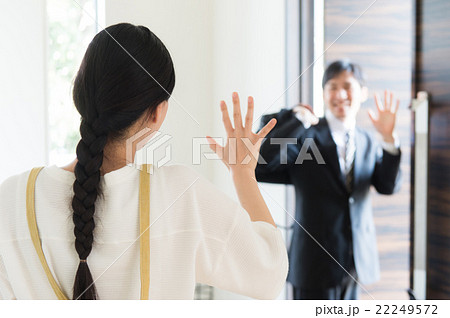 出勤する夫と玄関で見送る妻(夫婦・カップル・行ってらっしゃい・バイバイ)