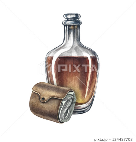 Cognac and a purse full of money. Handmade watercolor illustration. A vintage-style color image with a men's theme. A rich and well-off man. For banners, flyers, invitations, posters.
