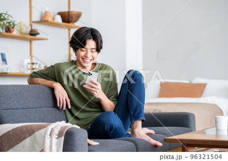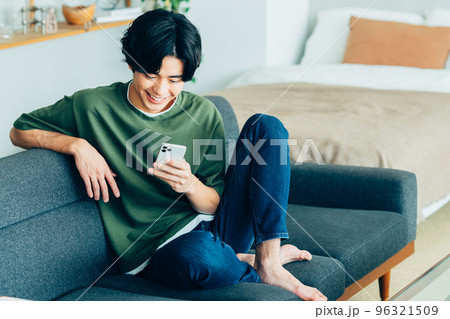 部屋でスマホを見る若い男性