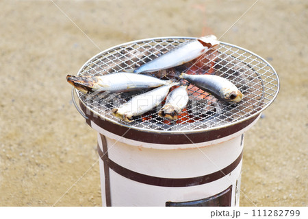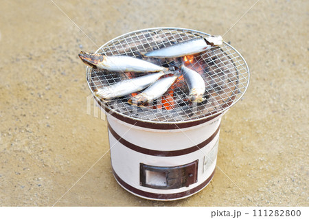 七輪で焼くイワシ 焼き魚と七輪 イメージ素材 節分イメージ