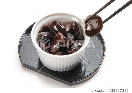 箸で摘んだ花豆の煮物