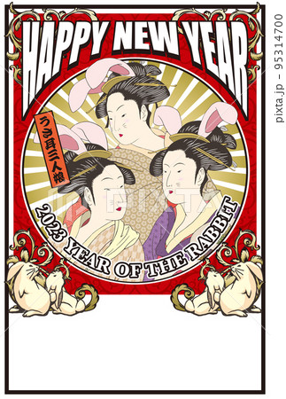 2023年賀状テンプレート「ウサミミ3人娘」ハッピーニューイヤー 手書きスペース空き