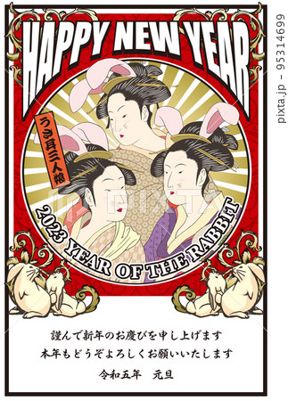 2023年賀状テンプレート「ウサミミ3人娘」ハッピーニューイヤー 英語添え書き付