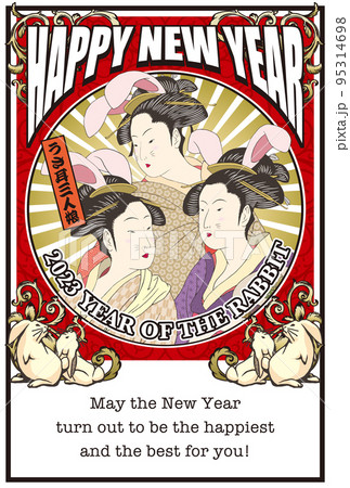 2023年賀状テンプレート「ウサミミ3人娘」ハッピーニューイヤー 英語添え書き付