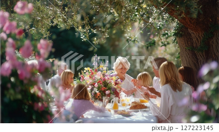 Family gathering in a garden with a floral centerpiece on a sunny day, sharing food and laughter