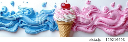 Colorful Ice Cream Cone with Cherry on Top Surrounded by Playful Swirls of Blue and Pink Cream