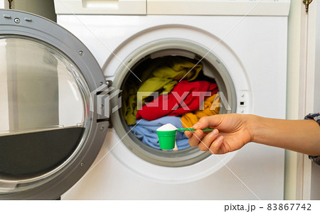 Washing machine with clothes in interior of the laundry room at home. Housework and cleaning concept.