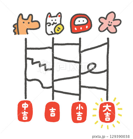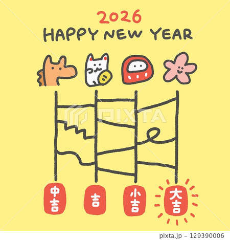 馬と正月の縁起物のかわいいあみだくじ年賀状 2026・おみくじ・正方形・ SNS用・Insta