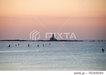 夕焼けの烏帽子岩に向かうSUP