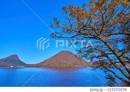 群馬県の榛名湖南岸から紅葉した木々越しに北東側(榛名富士,烏帽子ヶ岳)を見る
