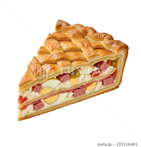 Savory slice of pie with golden lattice crust, filled with ham and hard-boiled eggs, like a traditional easter or picnic pie