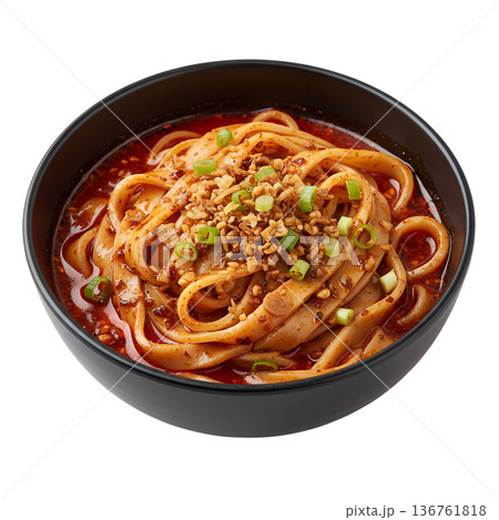 Delicious bowl of spicy dan dan noodles with ground pork, crushed peanuts, and fresh green onions, perfect for sichuan cuisine and asian food concepts