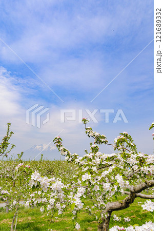 青森 岩木山麓 りんごの木と山桜