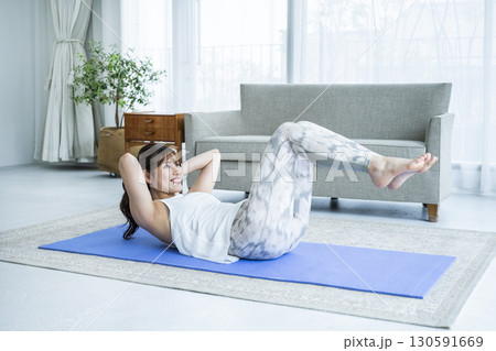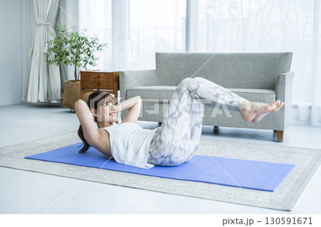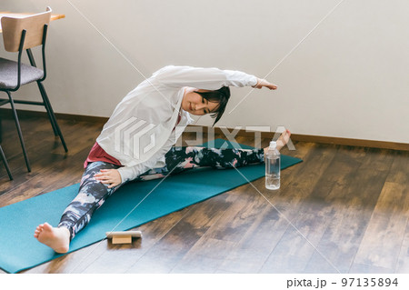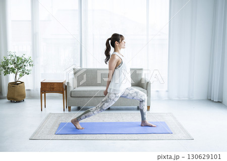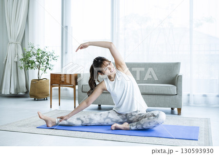 家でヨガ・ヨーガ・ストレッチをするアジア人女性
