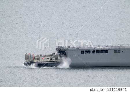 津波防災訓練で、輸送艦へ向け発進する海上自衛隊のLCAC