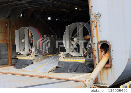 輸送艦に格納されたLCAC 海上自衛隊の輸送艦の内部